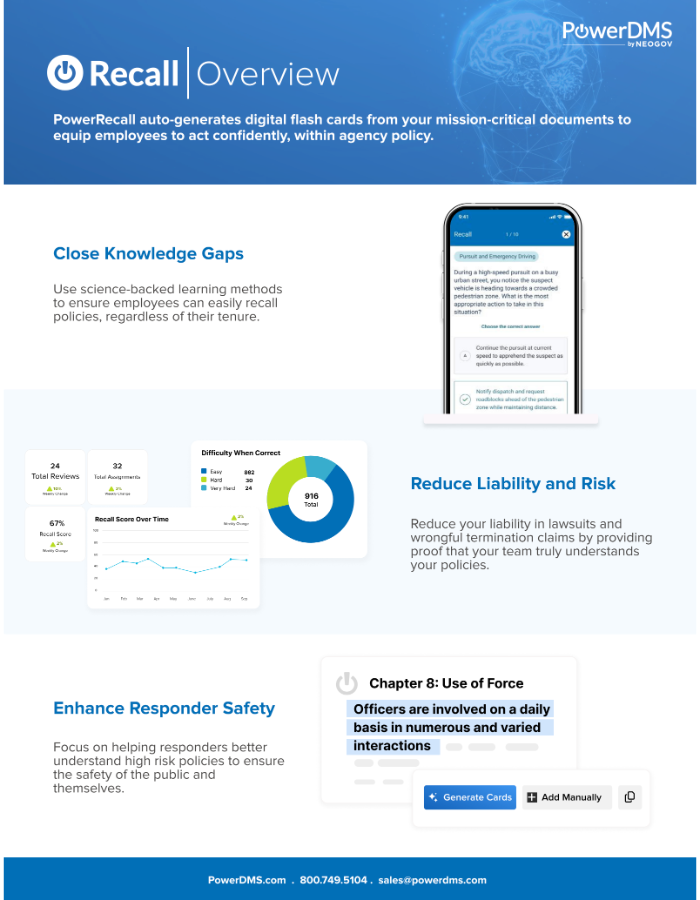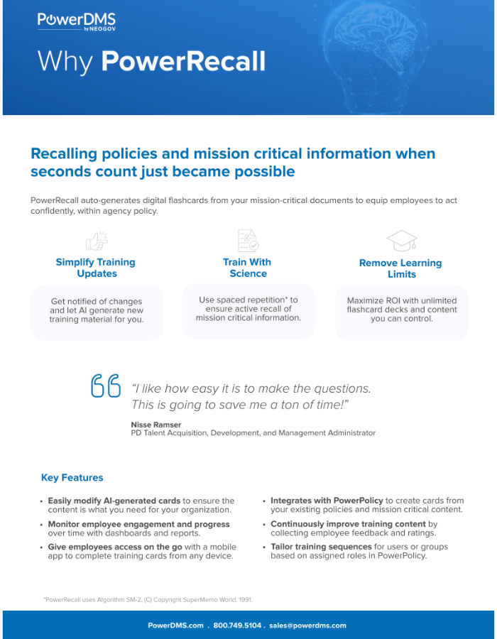PowerRecall is designed to reinforce employees' knowledge and recall of policy content, using AI-generated digital flashcards, created from your own job-critical documents in PowerPolicy.